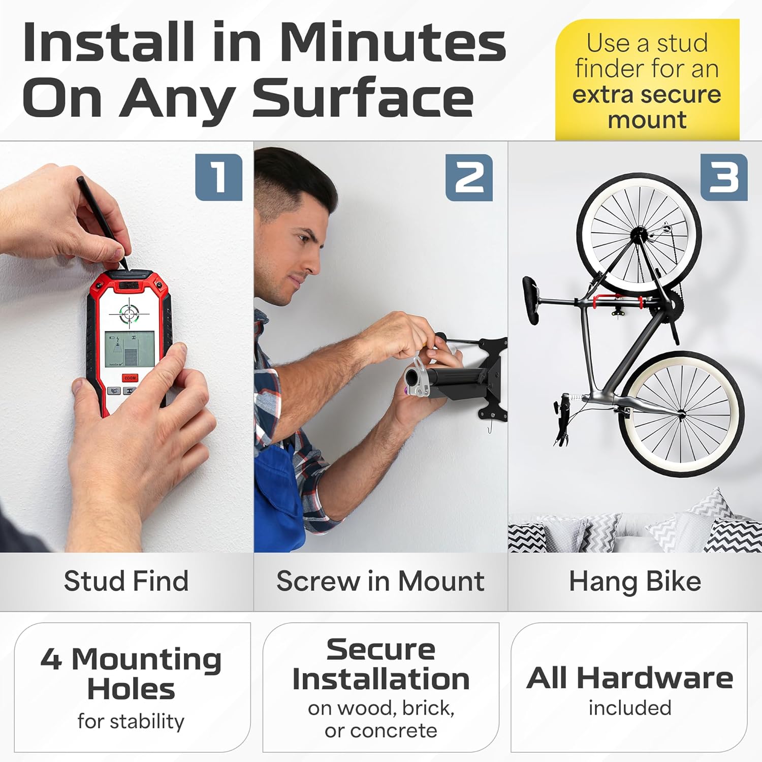 Hanging your bike is simple and requires no extra tools or advanced skills. Everything needed for installation is included in the package, such as screws and an easy-to-follow instruction manual. Whether you have drywall or brick surfaces, setting it up is quick and hassle-free.