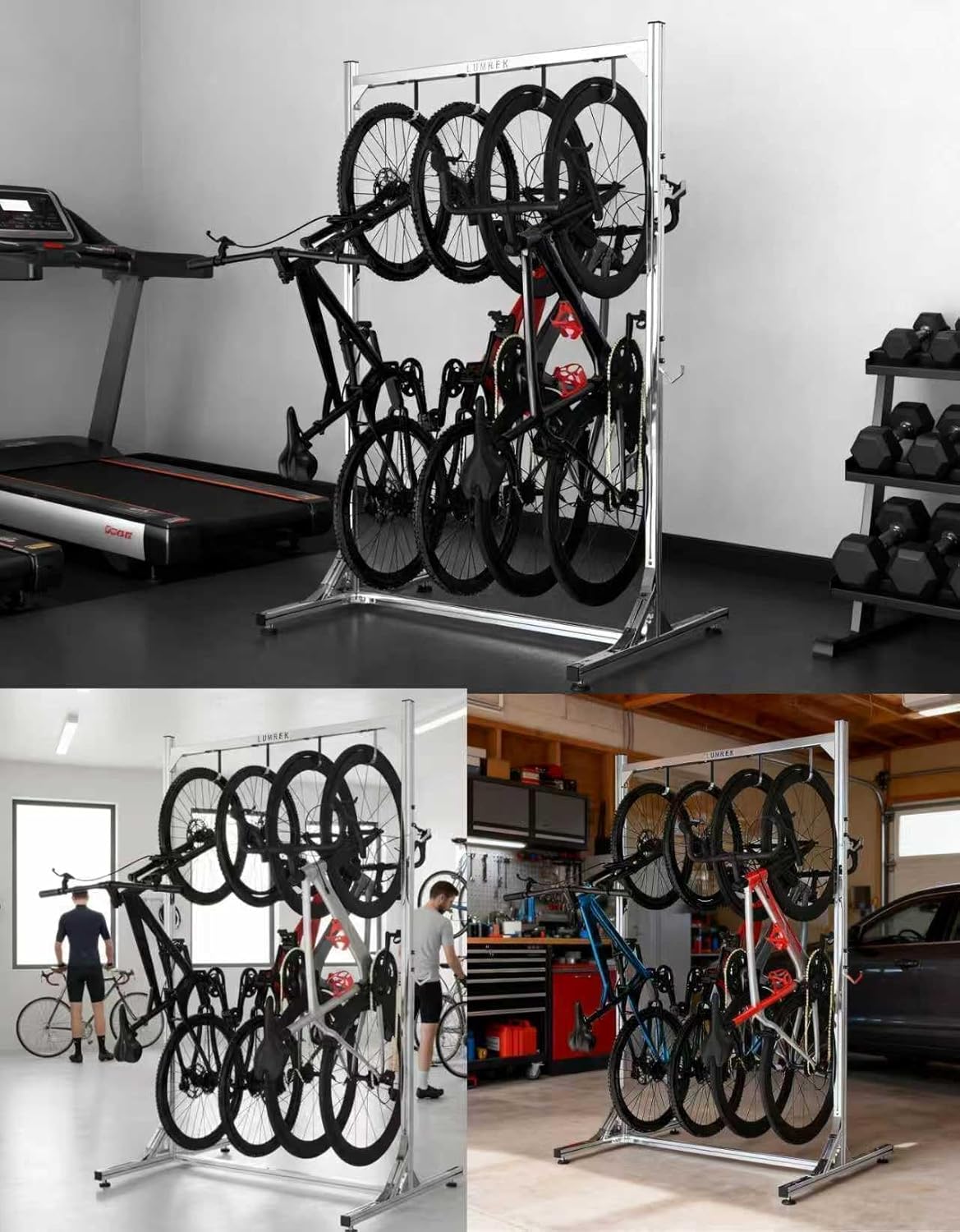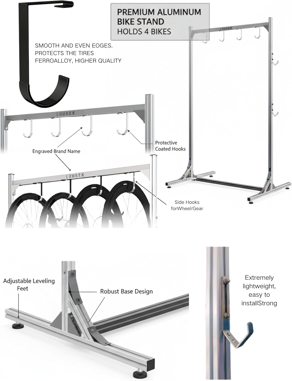Alumium Alloy Freestanding Bike Rack for 4 Bikes, Vertical Bike Storage Stand with 4 Bike Hooks for Heavy Duty & 2 Hooks for Tool Room Garage Storage Room Indoor Outdoor