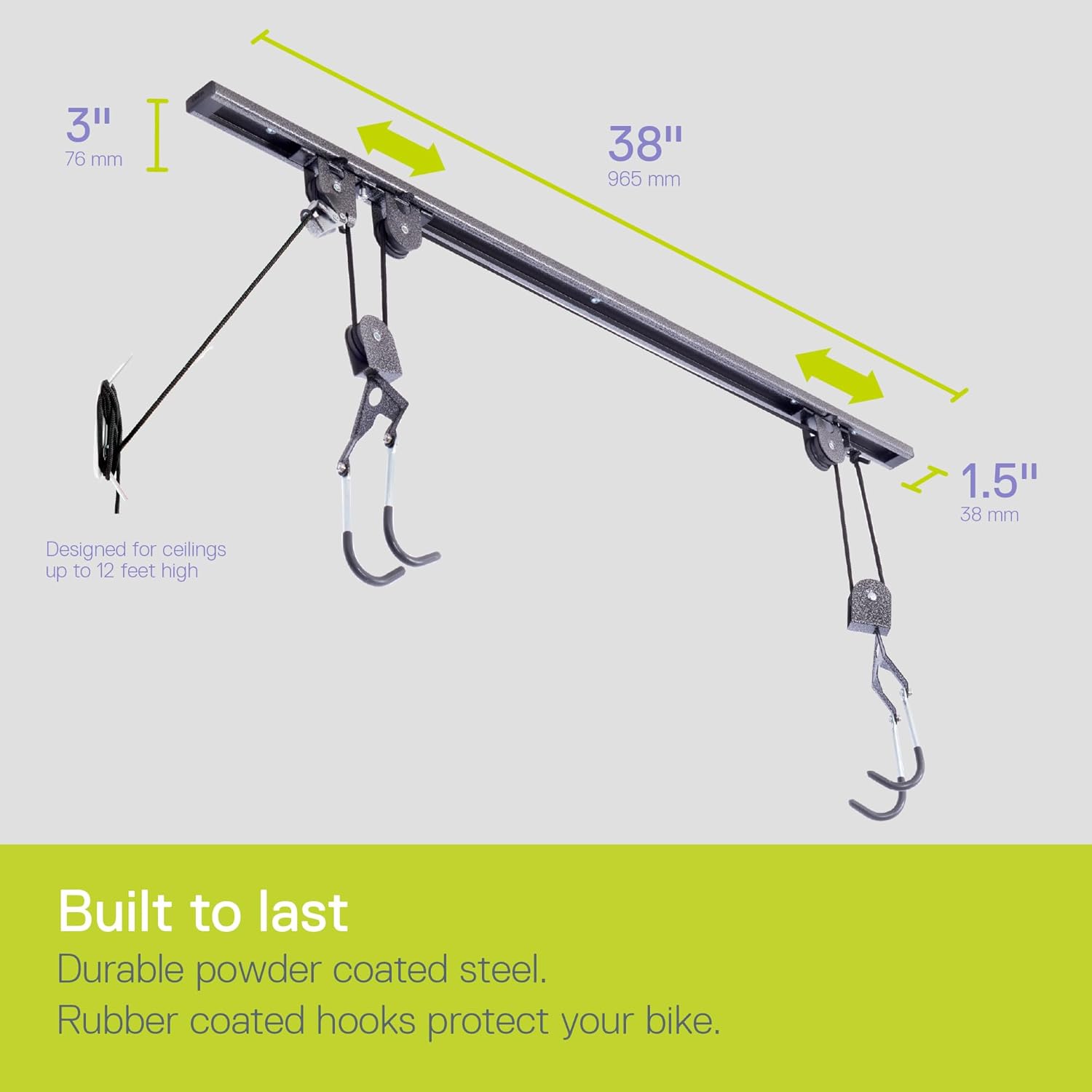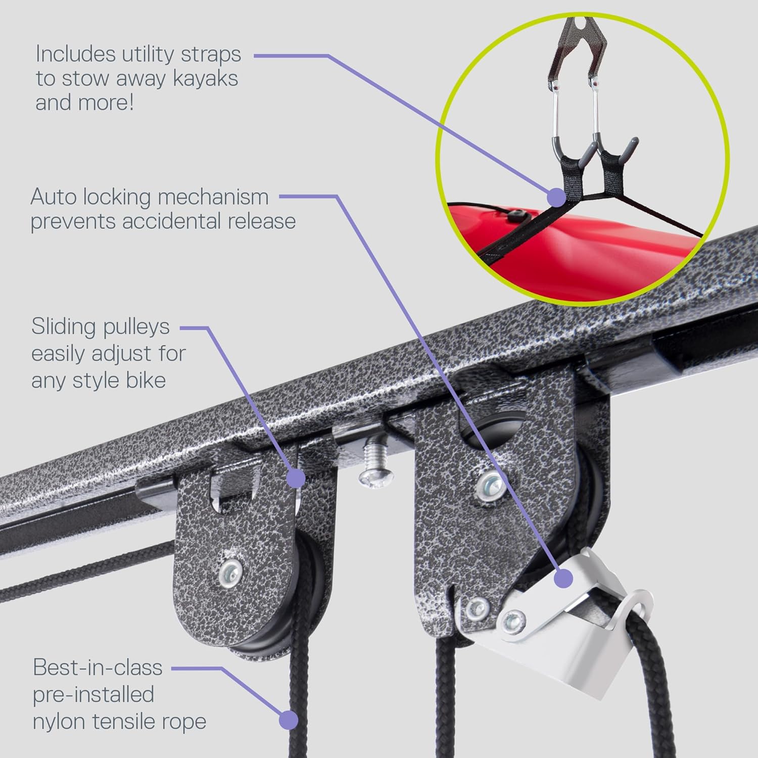 Bike Hoist- Heavy Duty for Space Saving – Road, Commuter & Mountain Bikes, Holds Kayaks & Ladders – No-Hassle Installation for Quick & Easy Access