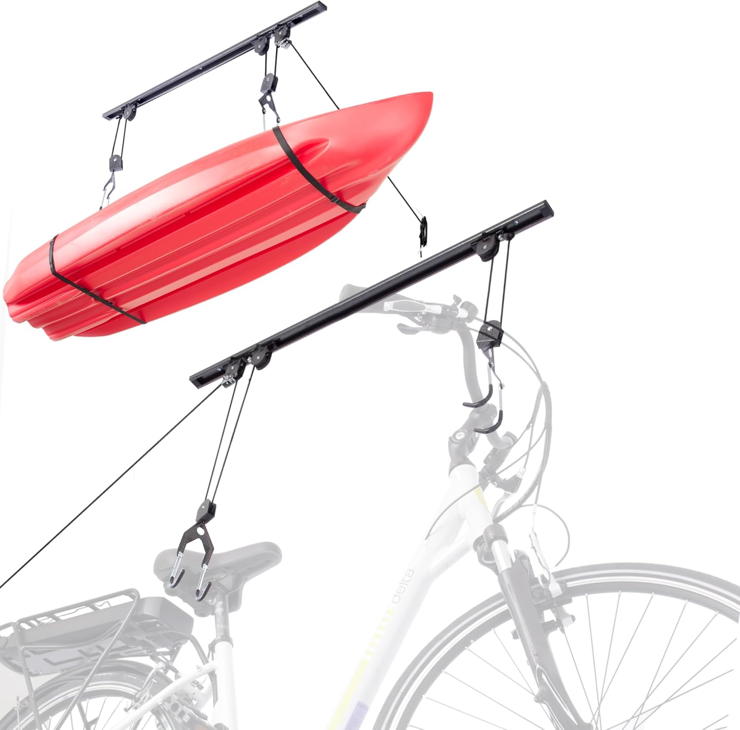 Bike Hoist- Heavy Duty for Space Saving – Road, Commuter & Mountain Bikes, Holds Kayaks & Ladders – No-Hassle Installation for Quick & Easy Access