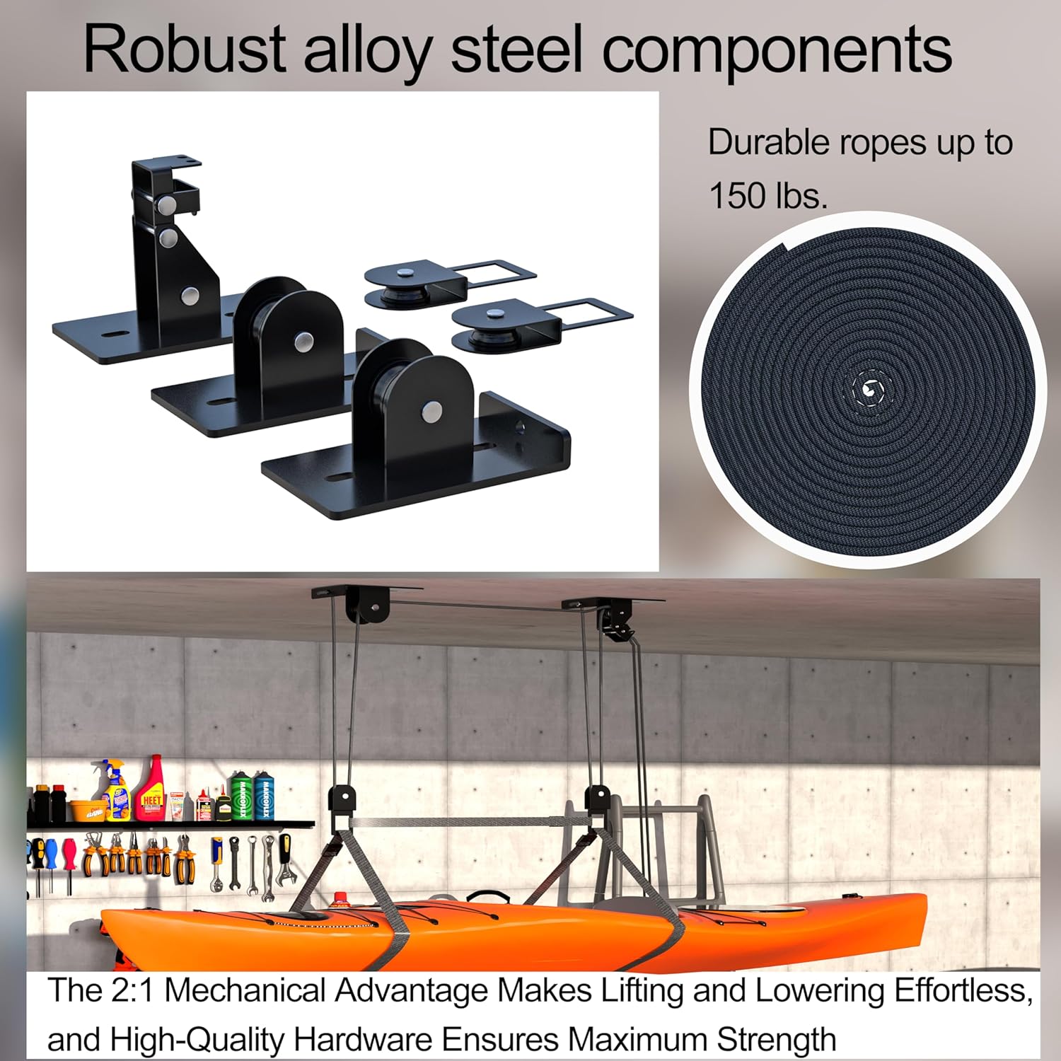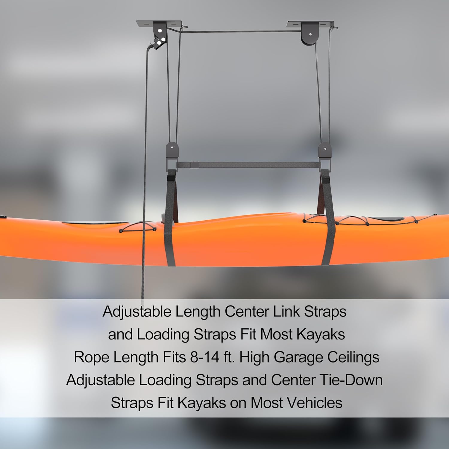 Ceiling Kayak Hoist, Heavy Duty Kayak Pulley System for Garage, Hold Up to 150 lbs Capacity, Canoe Garage Lift Storage System, Fit 10-14 Foot Ceilings, Black