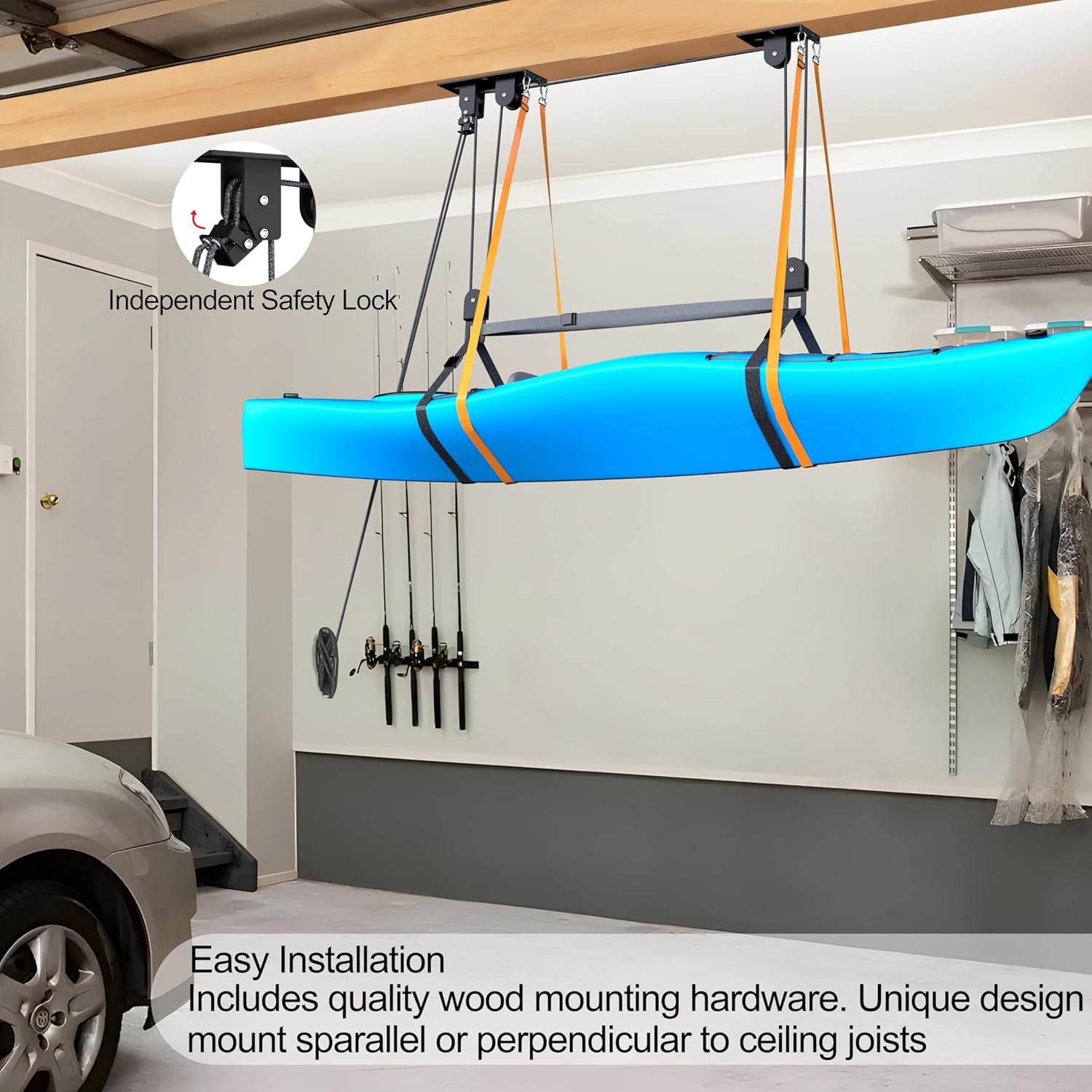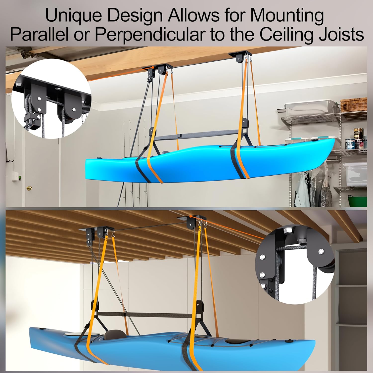 Kayak Hoist, Heavy Duty Kayak Pulley System for Garage Ceiling, Hold Up to 150 lbs Capacity, Canoe Garage Lift Storage System, Fit 10-18 Foot Ceilings, Black