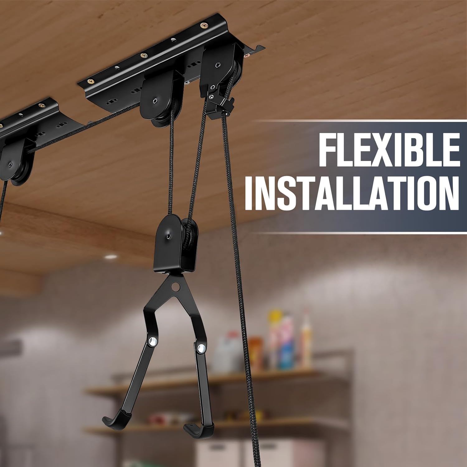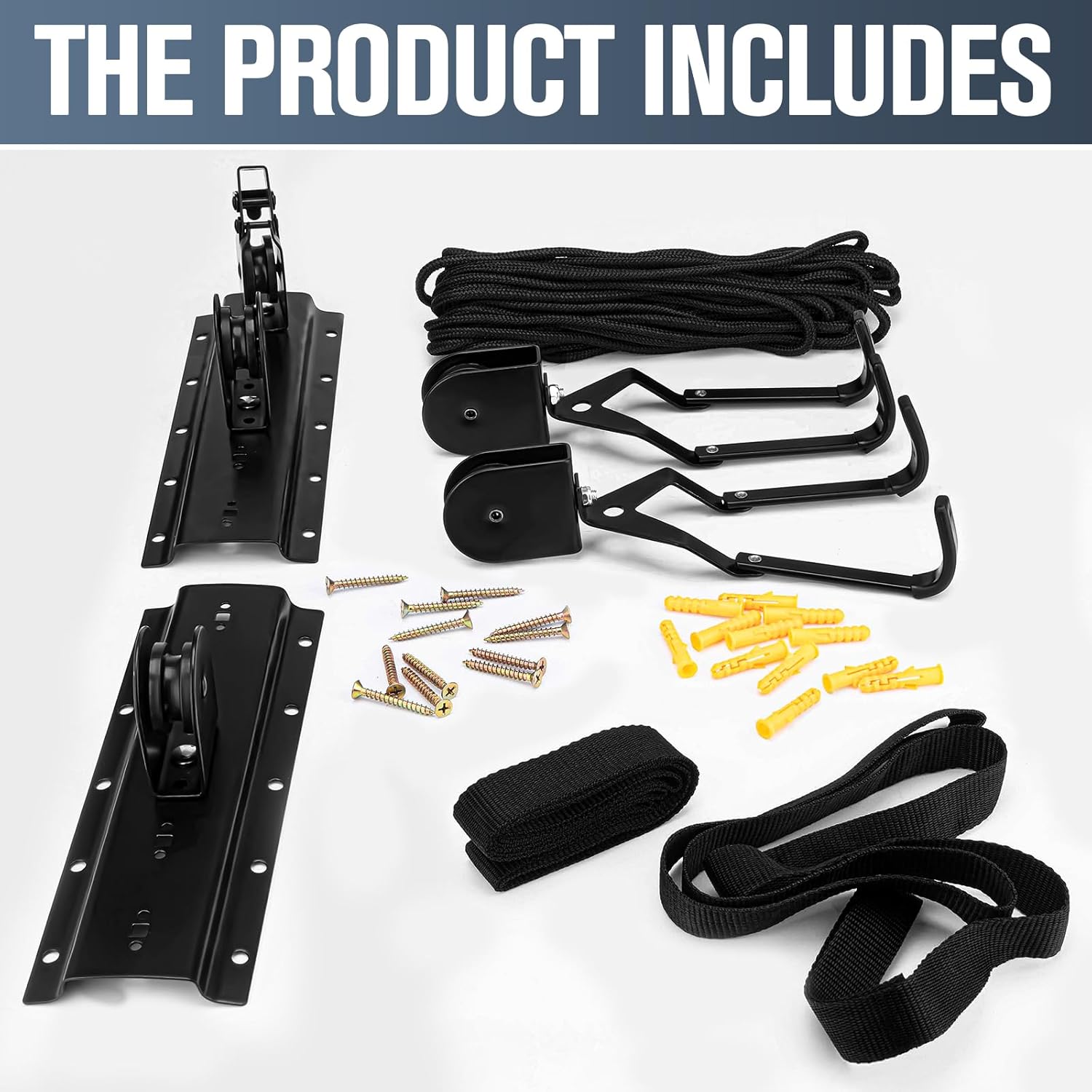 - Adjustable & Versatile for Multiple Uses: Designed for parallel or perpendicular mounting, this garage pulley storage system adapts to any layout. Adjustable straps secure cargo boxes, kayaks, bikes, and ladders, ensuring a custom fit. Ideal as a kayak hoist for garage ceiling or bike hoist for garage ceiling