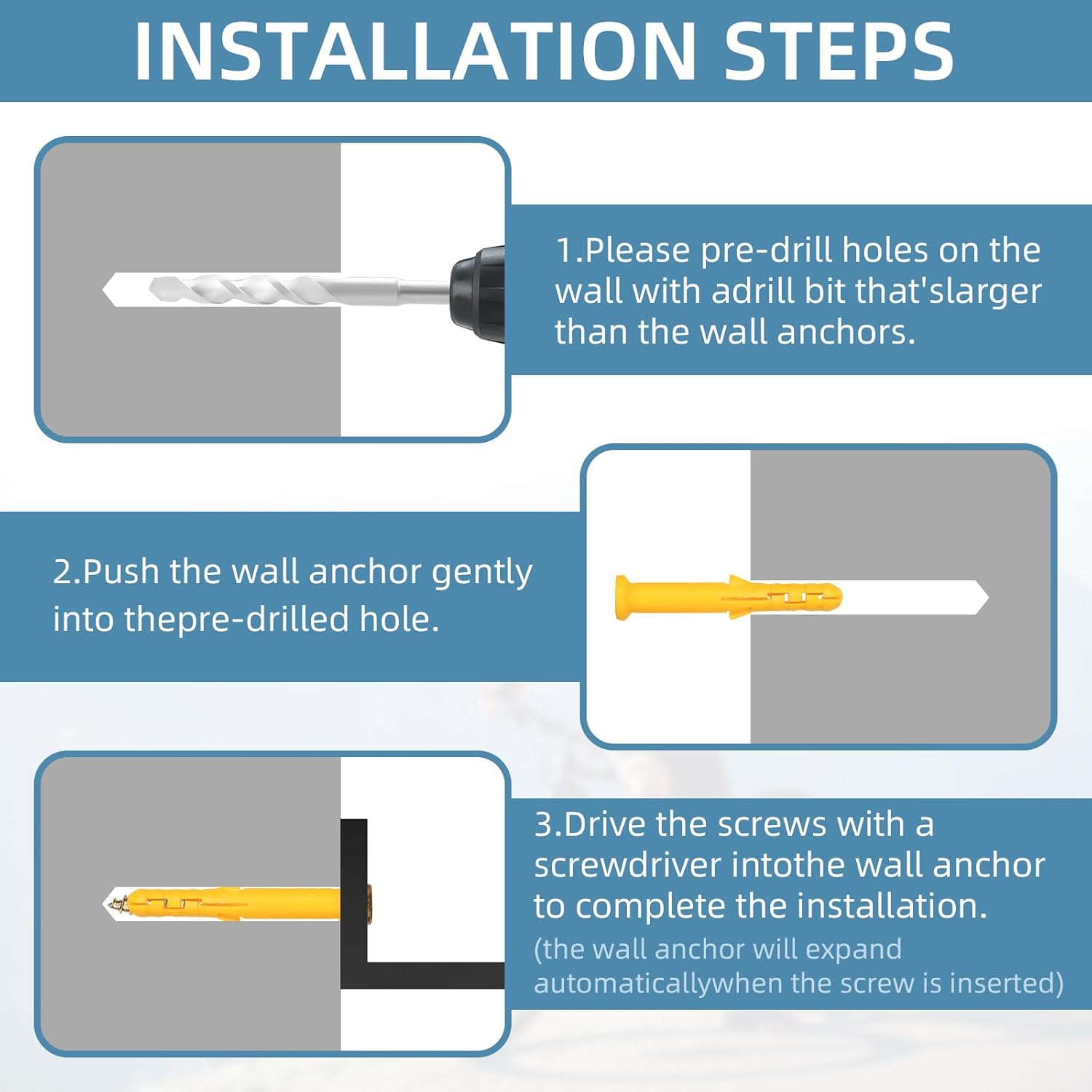 - {Easy to Use}: Installation is very easy and simple, measure the distance before installation, and install easily according to the included screws and anchors. Note: do not install on 'unsupported' wall surfaces such as plasterboard walls unless there is a strong wooden stud behind it.