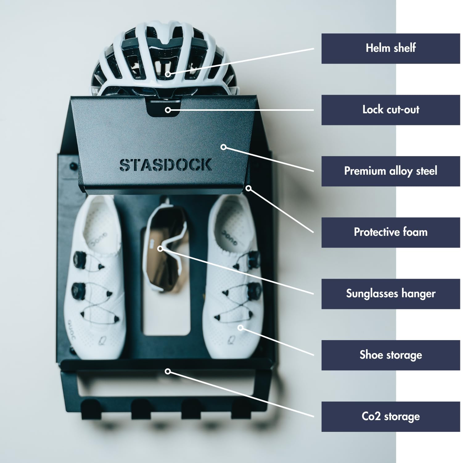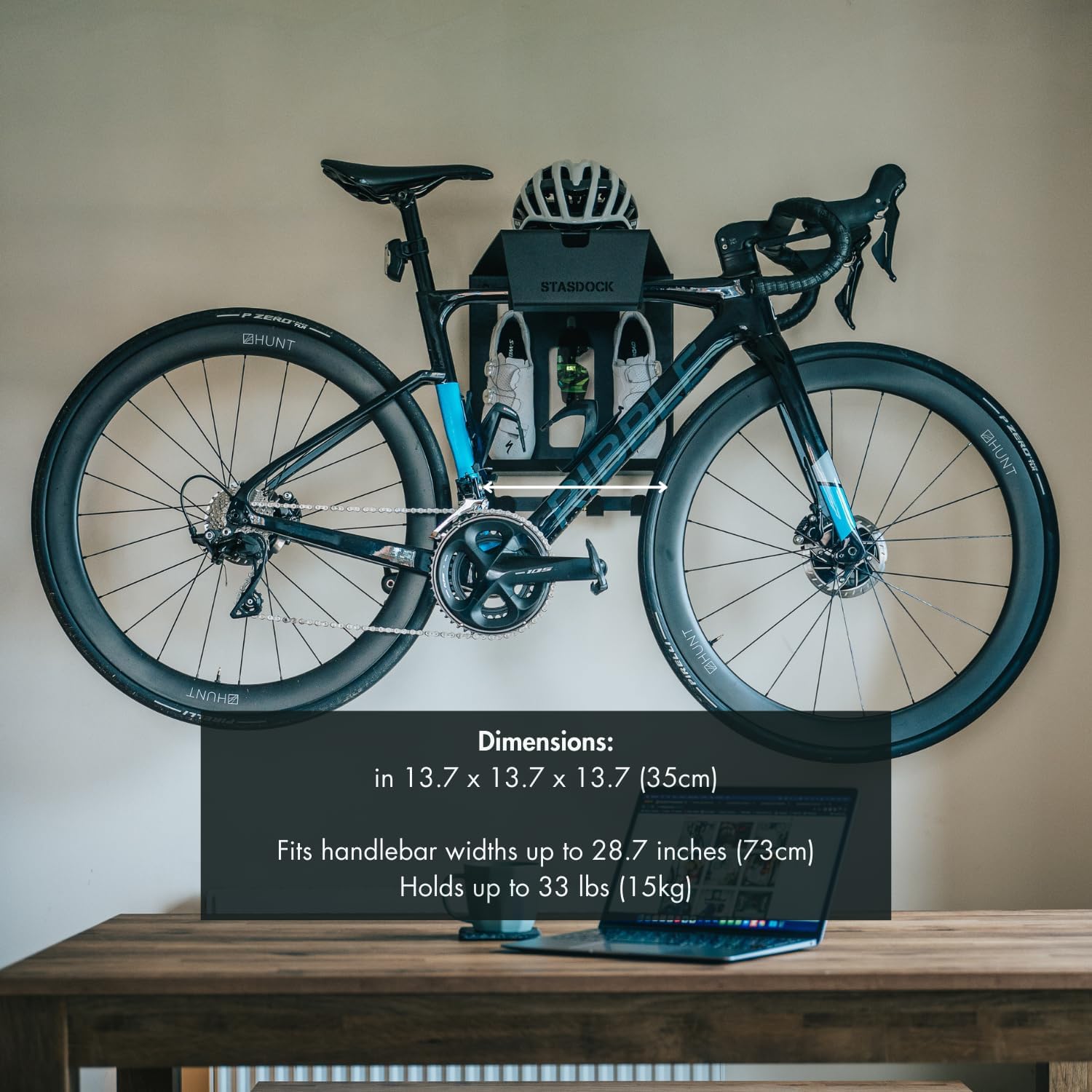 Stasdock Wall Bike Rack | Bike Storage Wall Mount System | For Race Bicycles (Happy Black) and Mountain Bikes | Bike Shelf | Indoor bike wall bracket | Store your helmet and shoes | Home and Garage