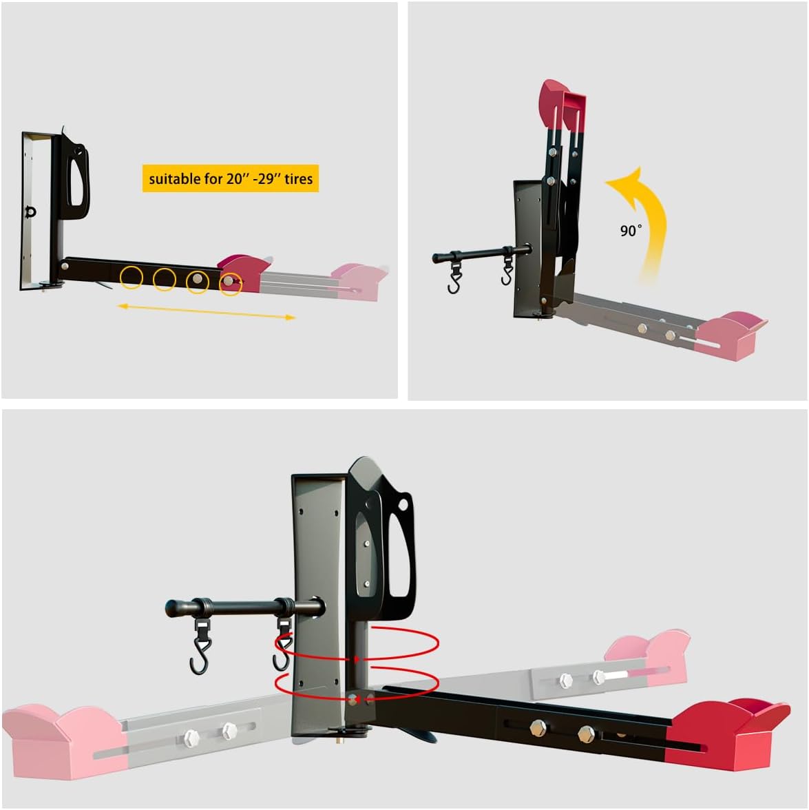 The bicycle rack also has a left and right rotation function, swivel up to 150°, it can perfectly use the wall space, and when not in use you can push the tire slot up, avoid touching the head.