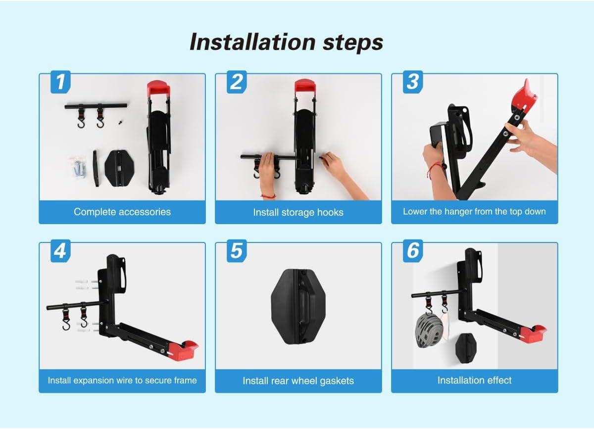 This bicycle rack does not need to be assembled, using the screws in the kit to embed it directly into the wall, and both accessories need to be fixed with screws. Be sure to measure the length of the front and rear wheels before installation to avoid unnecessary damage to the walls.