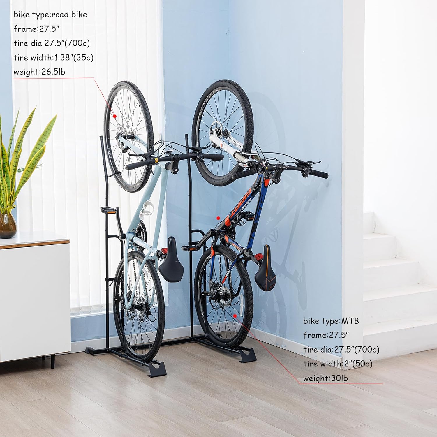 - 【Heavy-Duty & Stable】: Built with robust, high-quality steel construction, the vertical bike rack handles heavy loads to 60lbs. Its stable, reinforced base design ensures your bicycle stay securely upright, eliminating wobbles and providing total peace of mind.